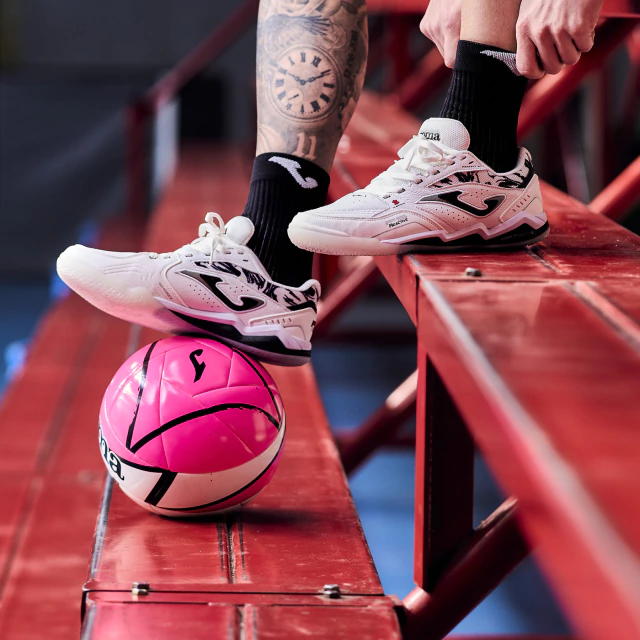Suela de caucho DURABILITY con gran resistencia a la abrasión. Se adhiere a superficies indoor sin dejar marcas en la cancha. Las estructuras geométricas ROTATION facilitan los giros y los cambios de dirección.